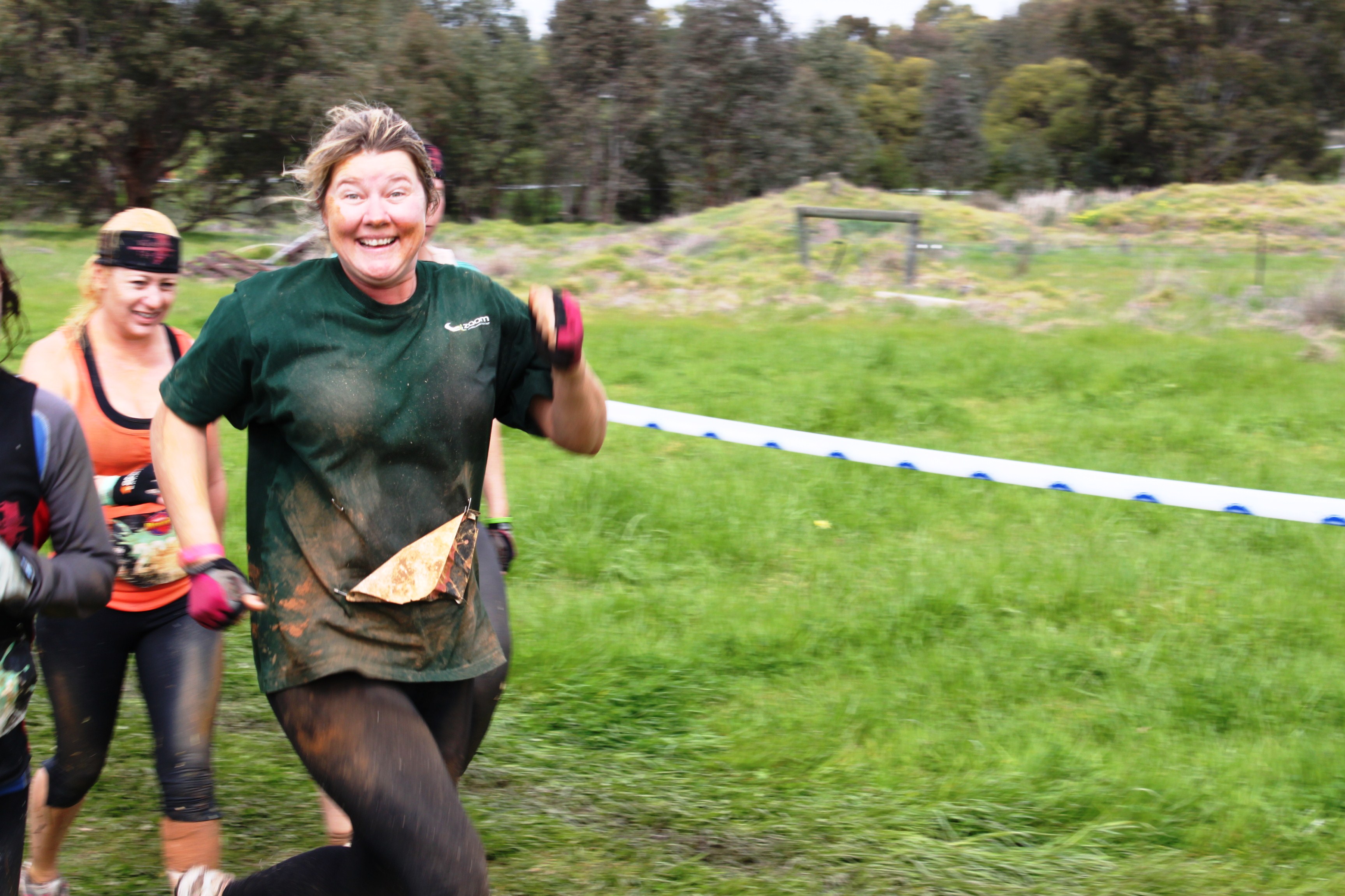 Mud fights, big logs and hurdles followed presenting little challenge for the Zoom team, with each individual making their way up, under or over anyway they could through the fences. Our team spread out a little before being stopped by a crowd waiting to tackle a rope net looped over a wooden beam about 2.5 metres high. Confidently we coordinated team members to hold the ropes out at the bottom while each person carefully climbed their way up and down again with safe foot placement until we were all on the other side. Cheers and yells rung out as we realised we’d conquered our first big wall and forward we went, perhaps even a little surprised at the success we were so far having.
